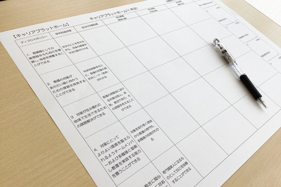 自分自身のなりたい看護師像へ向かって、日々の成長を確認しながら学校生活を送るためのツールです。自分で立てた目標をどれだけ達成できたかキャリアプラットフォームに記入しながら振り返りを行い、学校生活の中で着実にステップアップしていきます。